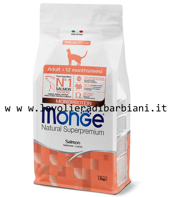 Monge Natural Superpremium Monoprotein* Gatto Adulto Salmone è un alimento completo e bilanciato per gatti adulti. Prodotto formulato con un’unica fonte proteica animale*, il salmone è il primo ingrediente e con l’inclusione di pesce fresco per una digeribilità e appetibilità ottimale. La formulazione è arricchita con XOS (Xilo-oligosaccaridi), prebiotici di ultima generazione che supportano il benessere intestinale. L’inclusione di ingredienti ricercati, come la rosa canina con componenti antiossidanti per poter contribuire a neutralizzare i radicali liberi e la yucca schidigera per il controllo degli odori intestinali, è frutto della ricerca Made in Italy per supportare la qualità di vita dei nostri gatti. Formulazione con acidi grassi Omega-3 per la lucentezza del pelo. Senza coloranti e conservanti artificiali aggiunti.
