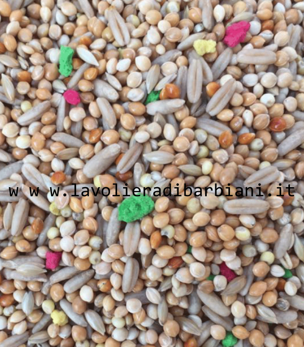 COMPOSIZIONE: Miglio, avena decorticata, miglio bianco europa, panico, miglio rosso, scagliola, biscotto colorato, (mela).