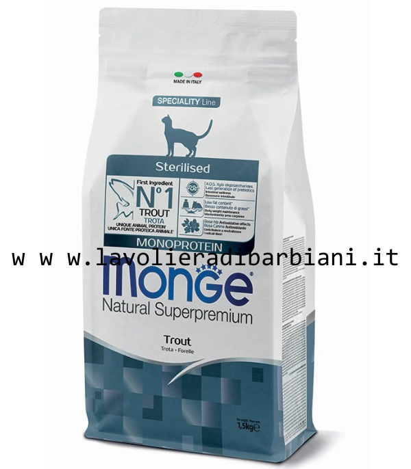 Monge Natural Superpremium Monoprotein* Gatto Sterilizzato Trota è un alimento completo per gatti adulti. Formulato appositamente per il tuo gatto adulto sterilizzato grazie alla presenza di un basso contenuto di grassi** per favorire il mantenimento del peso corporeo ideale. *Formulato con un’unica fonte proteica animale (trota), arricchita con Xilo-oligosaccaridi (XOS), prebiotici che supportano il benessere intestinale. Ingredienti ricercati, come la rosa canina, con effetti antiossidanti per poter contribuire a neutralizzare i radicali liberi, e la yucca schidigera per il controllo degli odori intestinali, per supportare la qualità di vita dei nostri gatti. Senza coloranti e conservanti artificiali aggiunti.